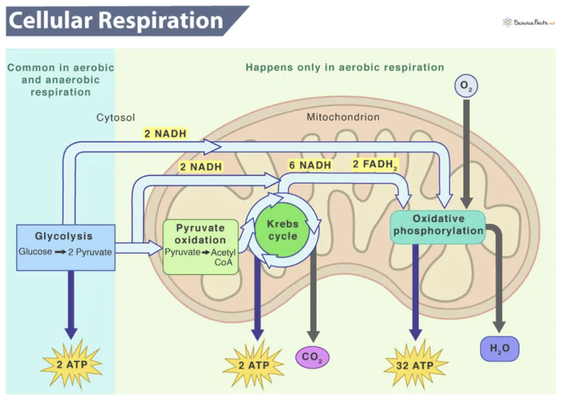 Cellular respiration: glycolysis, Krebs cycle, oxidative phosphorylation